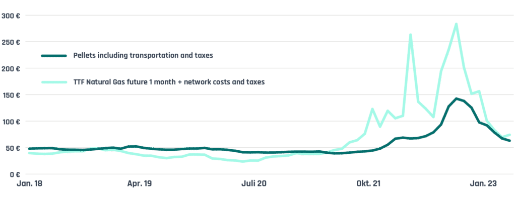 Vergleicht man die gesamten Beschaffungskosten einschließlich sämtlicher Nebenkosten, so entwickelten sich die Gesamtkosten der Wärmeversorgung mit Pellets auch in jüngster Vergangenheit, während der Gaskrise 2022 gegenüber Erdgas vergleichsweise günstiger, zudem war die Preisentwicklung insgesamt wesentlich weniger volatil als auf den fossilen Brennstoffmärkten (siehe nachstehende Grafik). Im Zeitraum 2021-2022 lagen die Gesamtkosten für Pellets sogar bis zu 30-50 % unter denen von Erdgas.